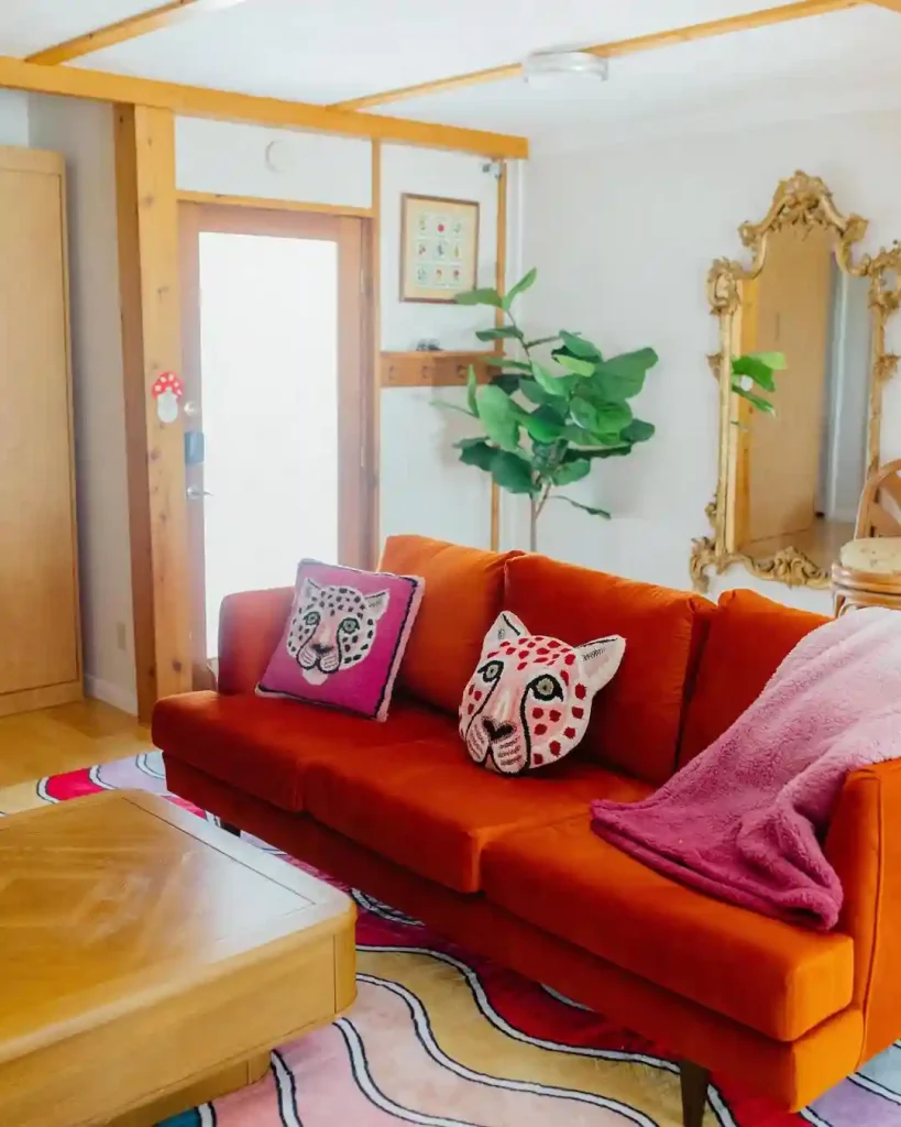 This vibrant living room nails the retro look with an eye-popping orange velvet sofa and quirky leopard pillows. The space feels fresh yet rooted in 70s style, thanks to the whimsical wavy rug and oversized gold-framed mirror. Natural light floods the room, softening the bold elements and highlighting the textured throw. A touch of greenery and a streamlined wooden coffee table balance the funkiness with earthy calm. This setup shows just how cheerful and creative 70s-inspired living rooms can be.