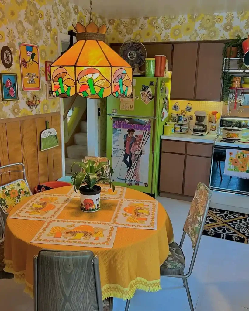 This kitchen is a burst of 70s sunshine. Golden daisy wallpaper, a stained-glass mushroom light fixture, and bright orange table linens make every detail feel nostalgic and happy. The green fridge, wood paneling, and retro appliances keep the theme consistent, while playful artwork adds personality. It’s like stepping into a Brady Bunch kitchen — fun, functional, and full of life. A great example of how bold patterns and colors can brighten everyday spaces.