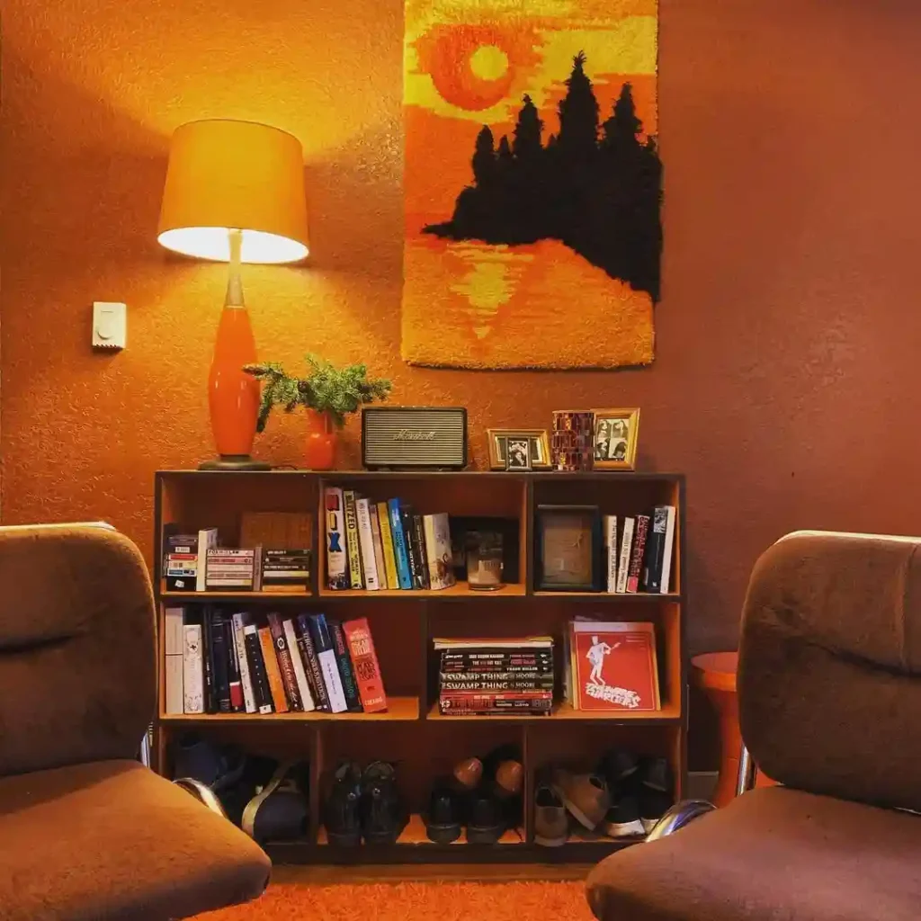 This cozy corner captures the heart of 70s home decor with its warm color palette and musical touches. The vintage record player, classic rotary phone, and plush brown armchair bring instant nostalgia. Burnt orange tones echo through the pillows, curtains, and wall art, while the sunburst mirrors and macramé plant hanger add groovy charm. The shag carpet and wood furniture ground the look, creating a space that feels both playful and lived-in. It’s a perfect setup for spinning vinyl and kicking back with a cup of coffee.