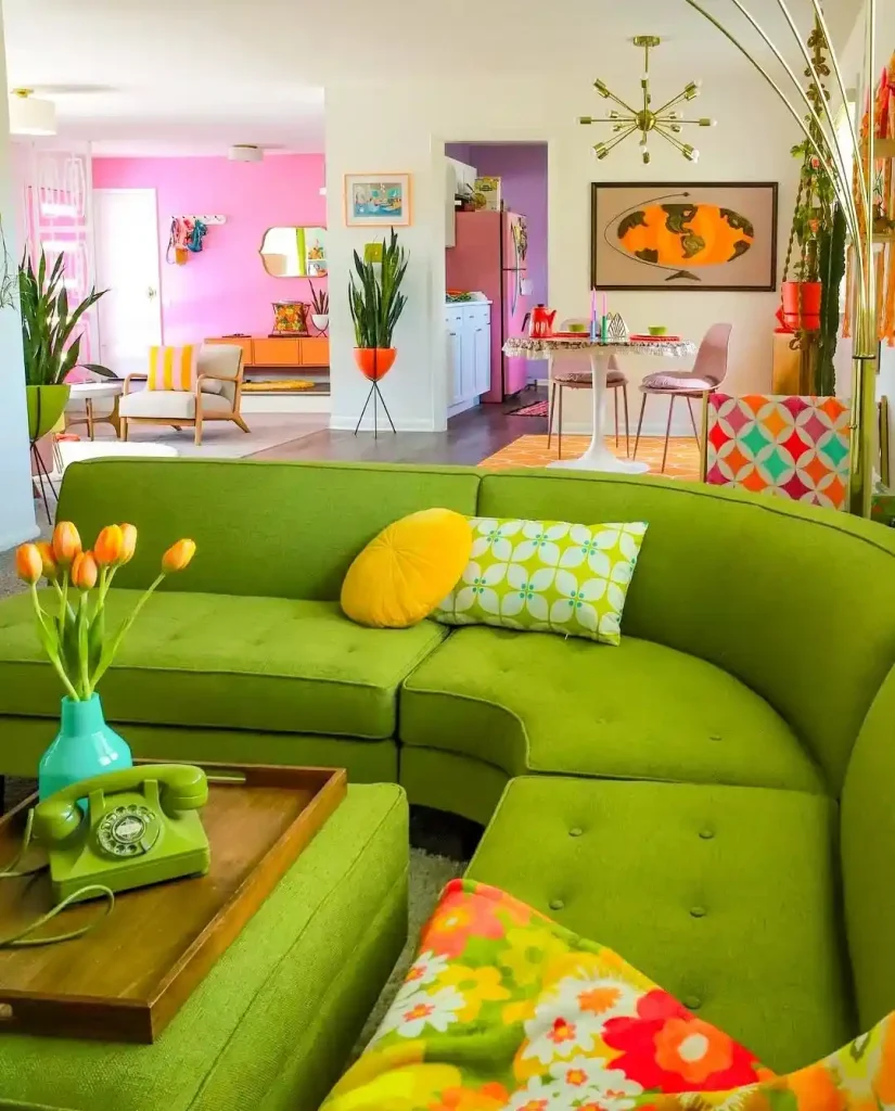 Talk about a cheerful retro vibe! This green curved sectional becomes the star of a colorful, open-concept living area. Bright pillows, a vintage rotary phone, and tulips in a turquoise vase all nod to classic 70s motifs. The space feels cohesive despite its bold colors, thanks to matching tones carried across the pink, orange, and yellow rooms. Rounded shapes, funky lighting, and playful accessories make this home feel like a true time capsule with a modern twist.