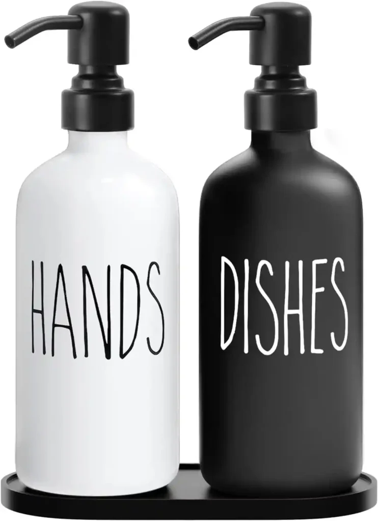Small countertop details can completely change how a sink area looks. A black and white glass soap dispenser set keeps things clean, simple, and coordinated instead of having mismatched plastic bottles sitting out. The labeled design adds a neat touch, making everything feel organized and intentional.