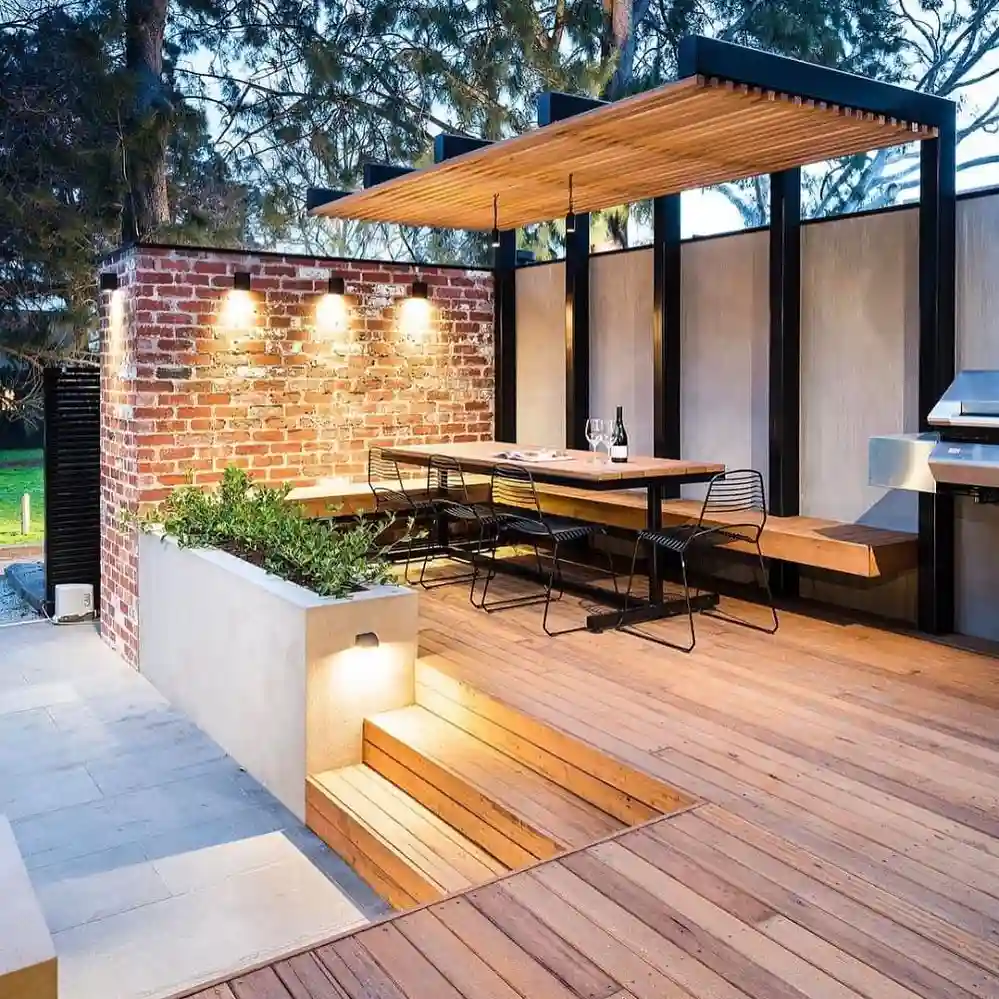 14. Brick-Walled Dining Deck with Sleek Pergola