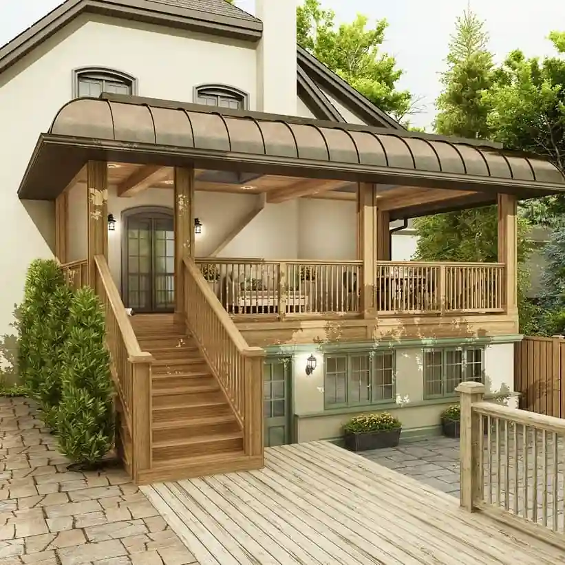 This elevated backyard deck comes with a stylish roof and traditional wooden railings, making it ideal for all-weather lounging. With stairs leading down to a stone patio and garden-level space, it feels both grand and inviting. The covered section is perfect for setting up a couch or outdoor dining set, while the open area below adds flexibility for entertaining. The attention to symmetry and classic details adds timeless charm.