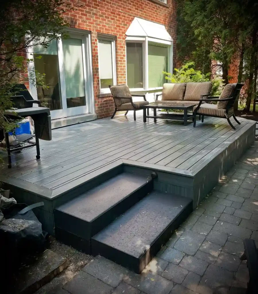 This modern deck keeps it simple and classy with a muted gray finish that contrasts beautifully against the red brick home. The angular corner steps add personality without cluttering the layout. A black framed furniture set with striped cushions ties the whole look together for a clean, relaxing space perfect for casual hangouts.