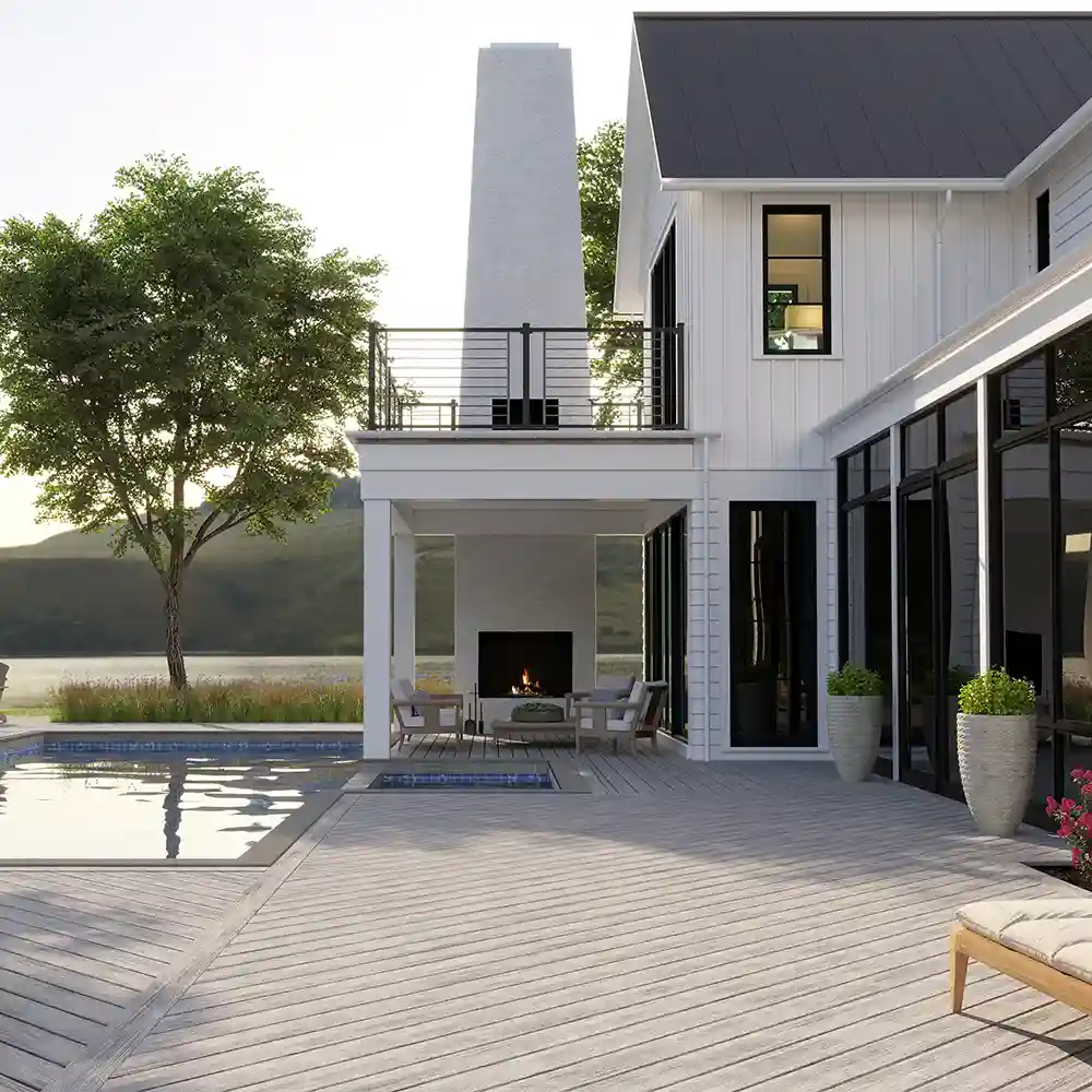 This stunning lakeside setup features a wide deck stretching out toward a reflecting pool. Clean gray boards run in a herringbone pattern for added texture, while a covered fireplace lounge area provides warmth and shelter. The black railings and modern furniture finish off this serene, luxury space.