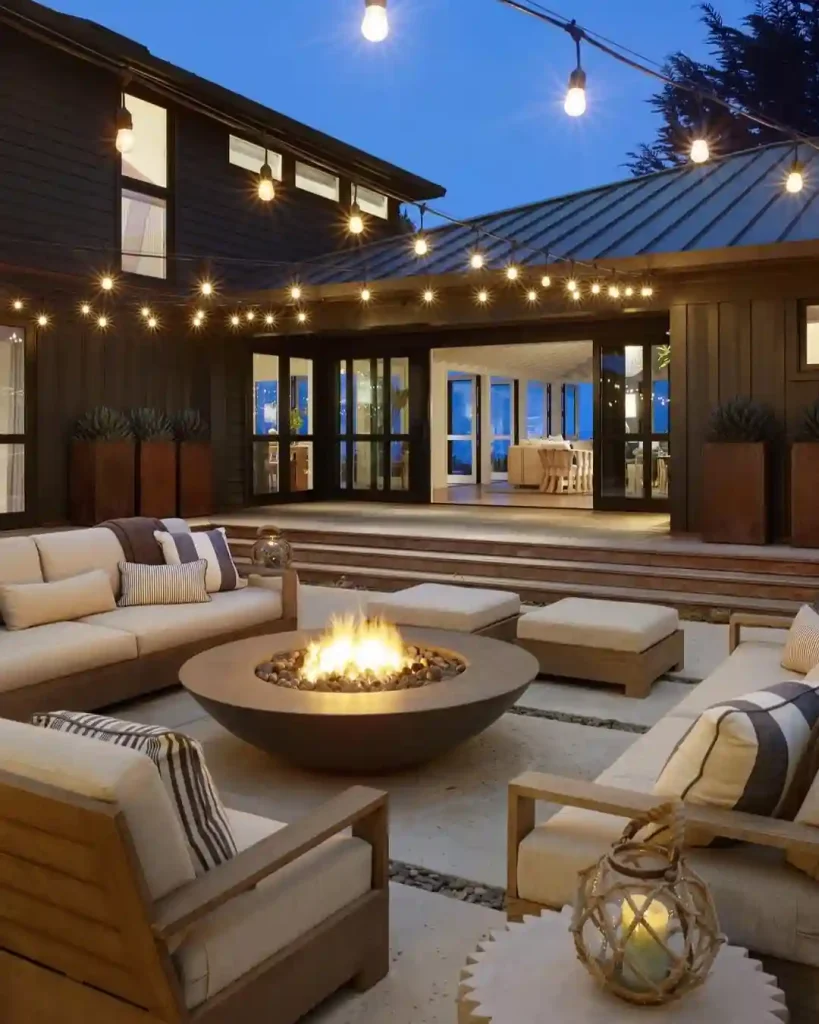 This backyard is built for magical nights. Warm string lights crisscross the open sky, creating a soft canopy above the circular fire pit. Surrounded by plush cushioned seating, the space feels like an upscale outdoor lounge. The layered steps behind the pit seamlessly connect the deck with the home’s interior.