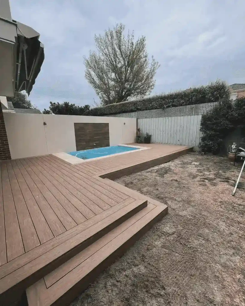This minimal deck design features clean lines and a soft brown finish that wraps elegantly around a small in-ground pool. The tiered entry steps add depth while the surrounding wall and neutral color palette keep the look crisp and spa-like. Ideal for low-maintenance lounging and sunbathing.