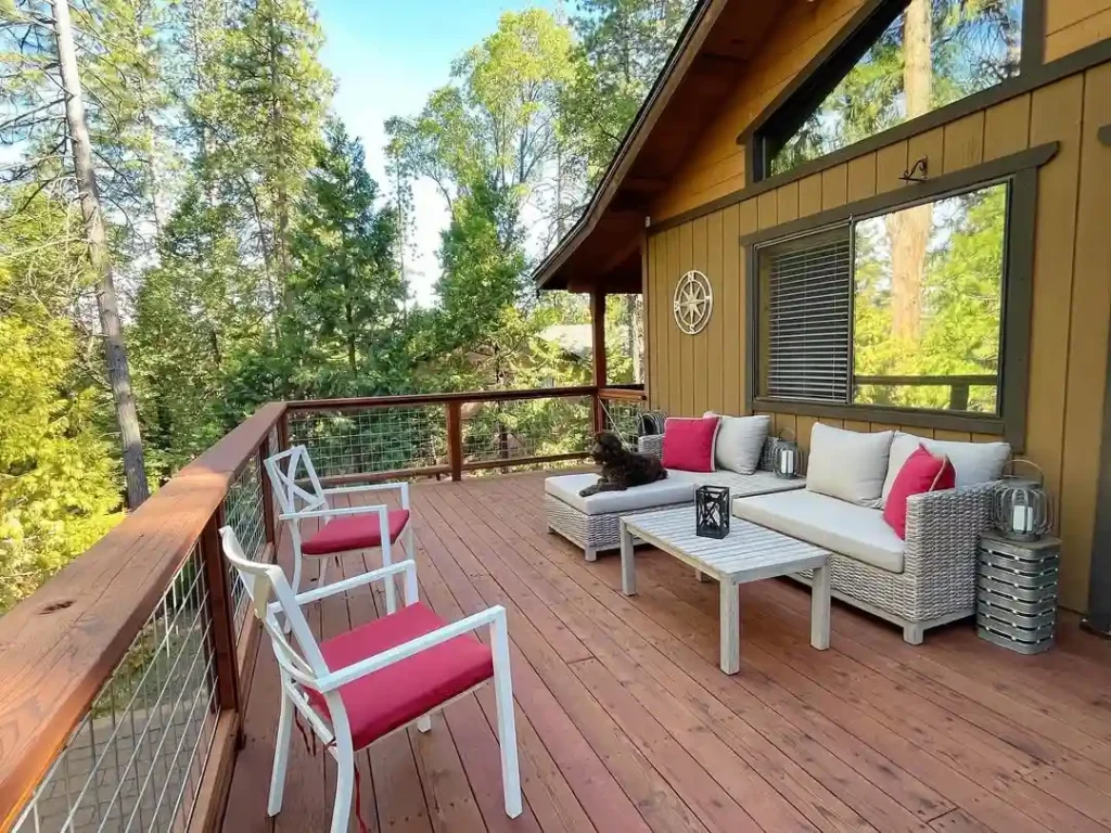 Nestled among tall trees, this deck opens up to a forest view and features stylish cable railing for safety without blocking the scenery. Pops of red from the cushions add a playful twist to the neutral seating. The layout is airy and inviting, ideal for mountain cabins or wooded homes.