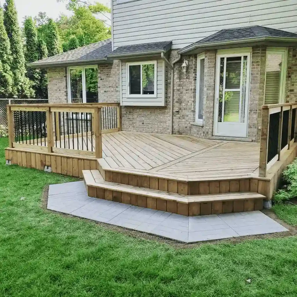 This deck uses a creative geometric layout with angled corners and a tiled landing pad at the base of the stairs. The two-step entry is inviting, and the black balusters within the wooden railings create a classic yet contemporary vibe. The shape makes the space feel larger and more custom without needing a massive footprint—great for families who want a unique look with function.