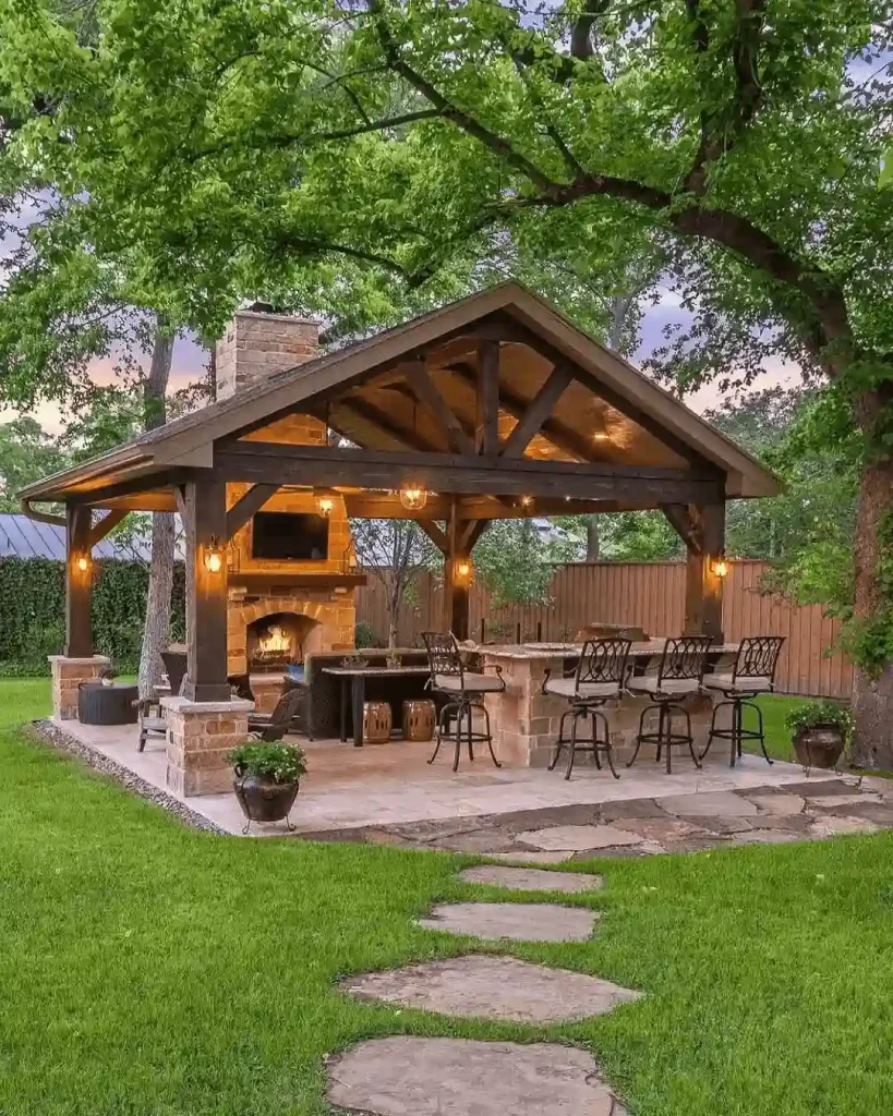 This dreamy backyard setup is like an outdoor living room with its gabled pergola roof, bar seating, and stone fireplace. The warm lighting under the roof adds ambiance for evening get-togethers. Paired with comfy chairs, a TV, and stone bar counters, it turns your yard into a full outdoor kitchen and entertainment zone. Ideal for anyone who wants to blend comfort and wow-factor.