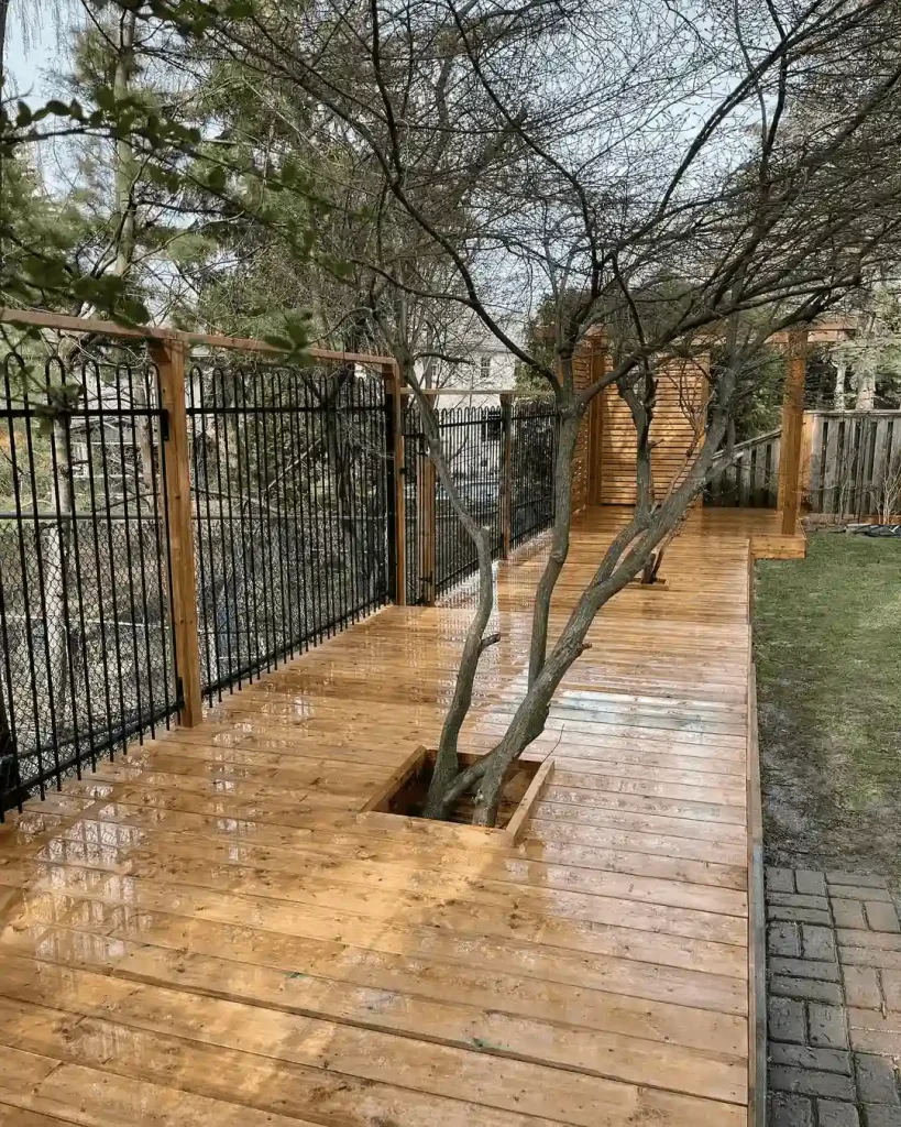 This unique deck blends right into the natural surroundings with a sleek wooden path that curves around existing trees. Built-in tree wells allow branches to stretch freely, adding a serene, organic element to the space. The glossy wooden finish and black fencing give it a clean, finished look, perfect for shaded walkways, reading spots, or a peaceful garden stroll. It’s a functional design with a deep appreciation for nature.