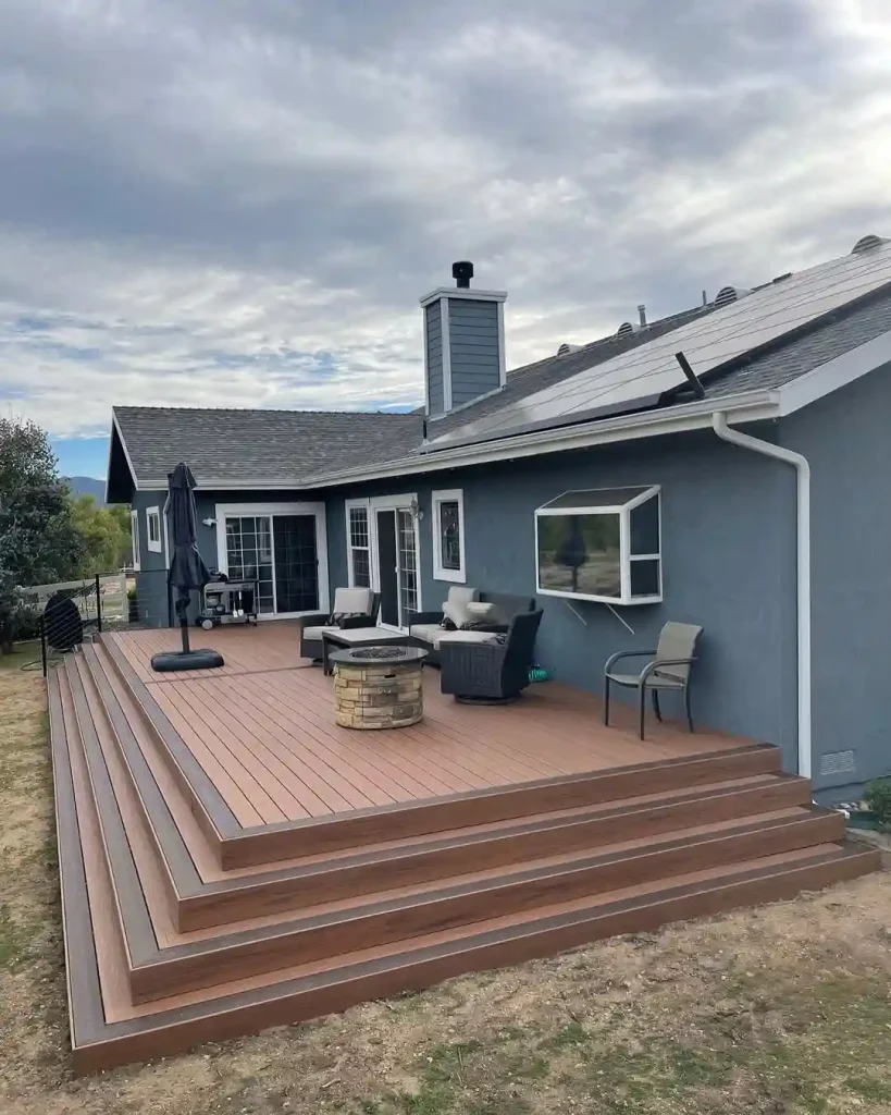 This beautiful composite deck features a multi-level layout with wide, wraparound steps that double as casual seating. At the center is a circular stone fire pit, adding warmth and a cozy focal point. The layout is clean and symmetrical, offering plenty of space for furniture and entertaining. The dark border trim contrasts nicely with the lighter brown planks, creating a polished, modern finish. It’s a perfect spot to gather around in the evenings with friends or family.