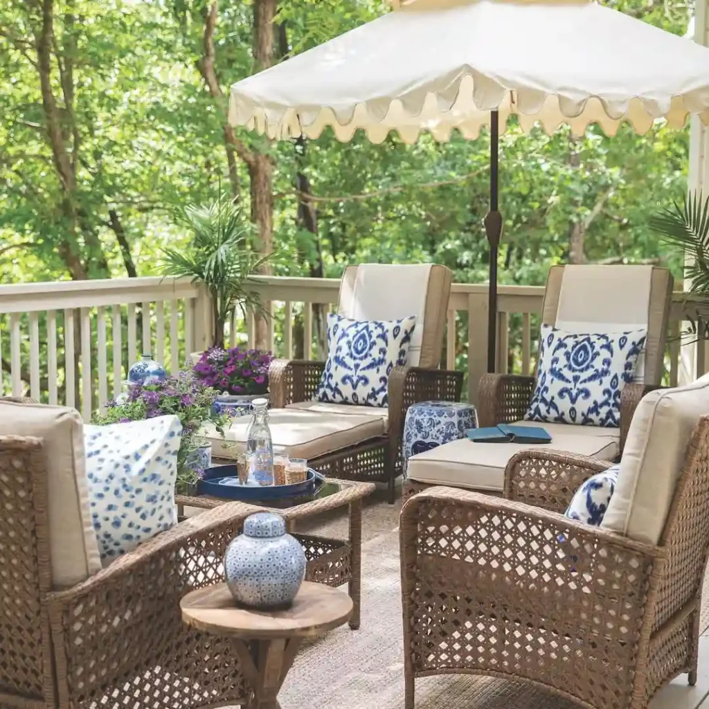 Classic rattan chairs with beige cushions meet bold blue-and-white pillows for a timeless look. A soft scalloped umbrella shades the seating, while a wood tray table adds functionality. Blue pottery and fresh blooms round out the color palette, making this patio perfect for afternoon tea or relaxed family gatherings.