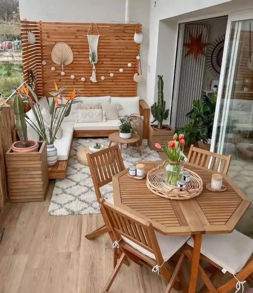 Compact but full of style, this balcony patio combines clean lines with cozy elements. A wooden slatted wall provides both privacy and character, decorated with hanging plants and boho-inspired decor. A small round table and corner sectional seating make it a perfect space for morning coffee or sunset snacks.