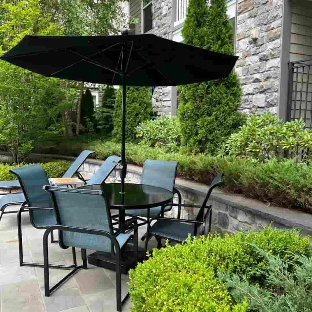 11. Classic Black Umbrella Patio Setup