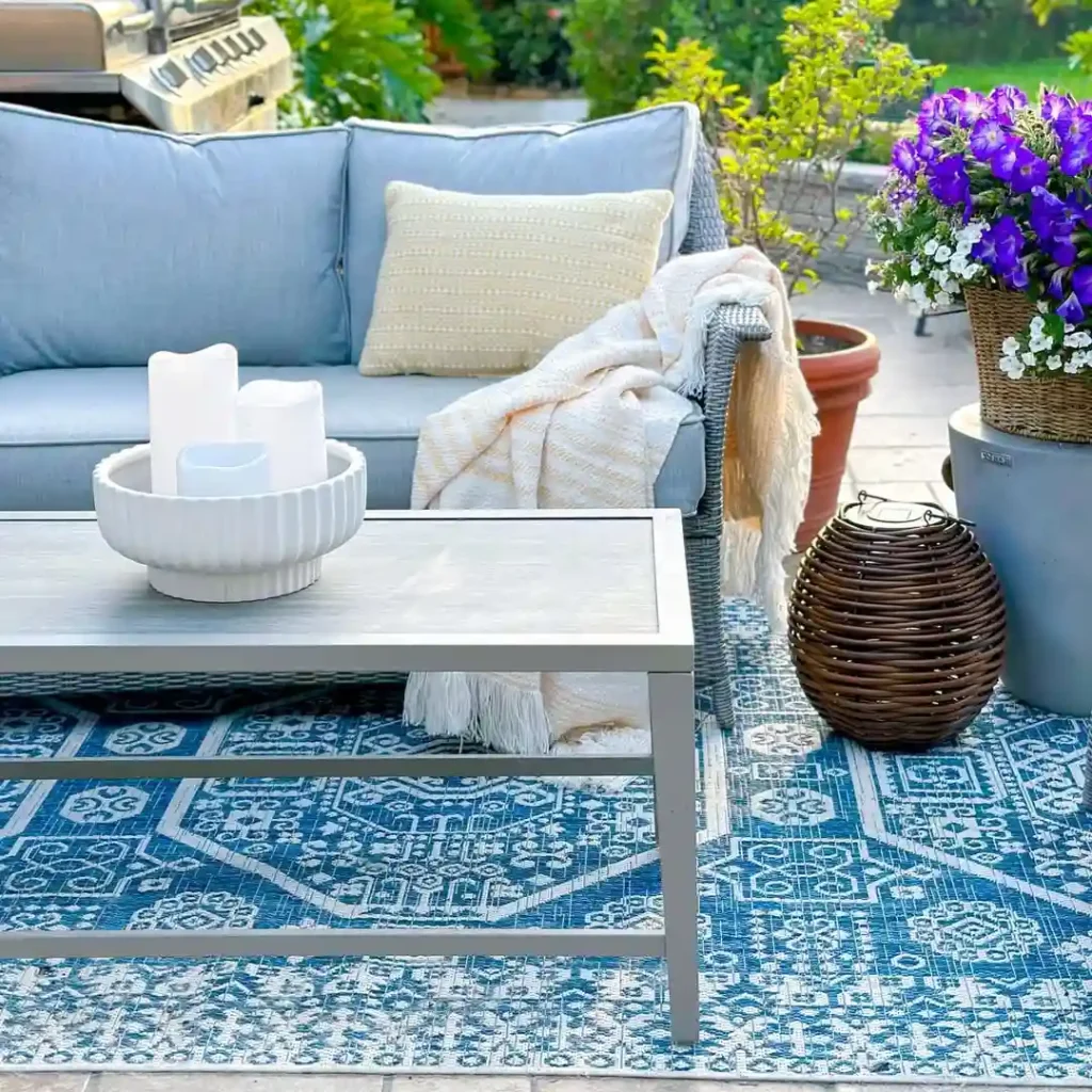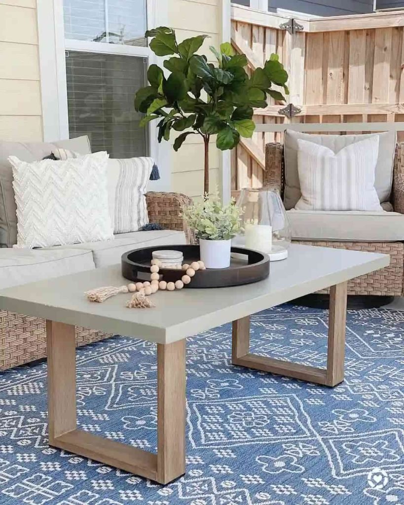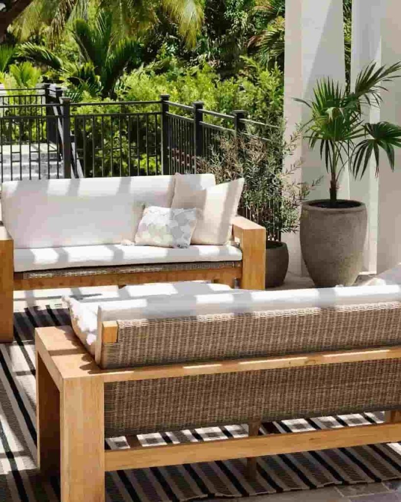 Natural wood frames, rattan textures, and soft white cushions come together in this clean-lined patio. Set against a backdrop of tropical foliage, the minimalist striped rug adds just enough contrast to anchor the space. It’s ideal for anyone wanting a breezy, coastal feel without overdecorating.