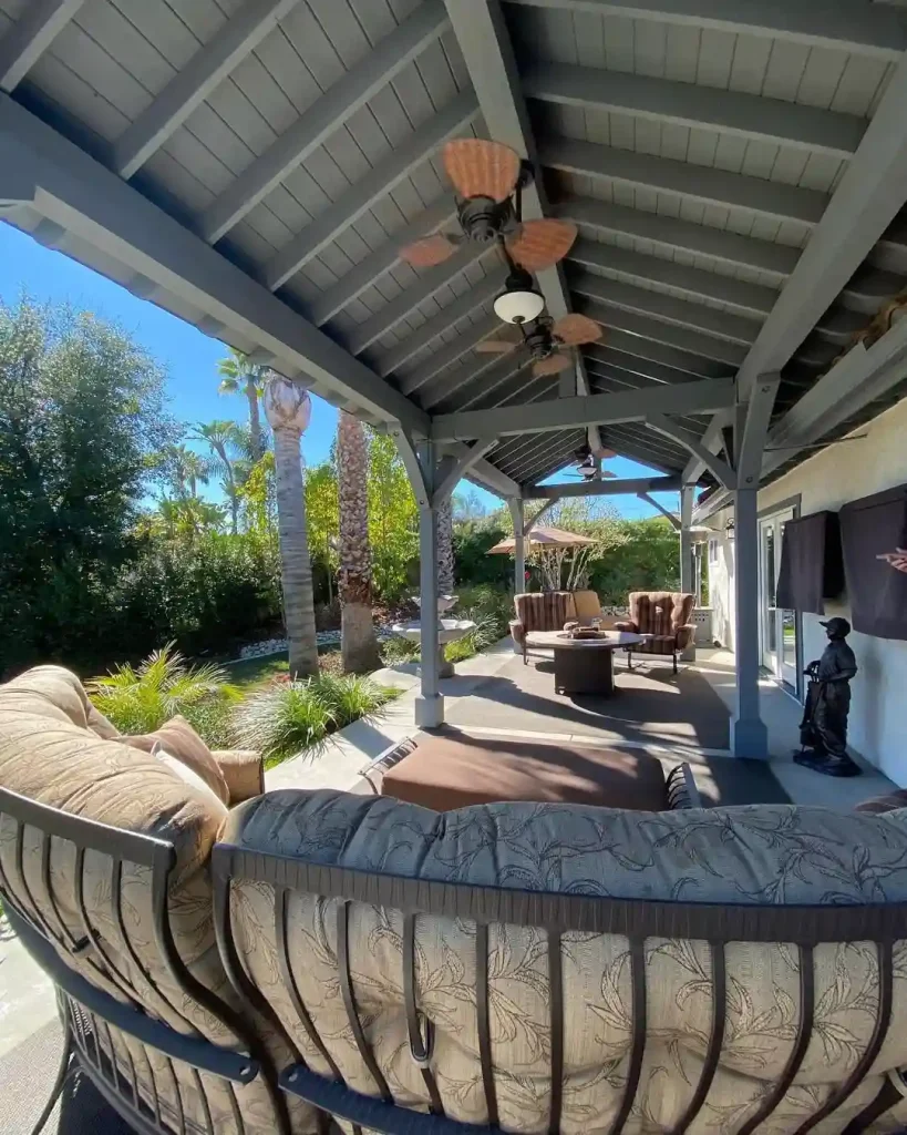 A deep-covered structure makes this patio a shady retreat on sunny days. Overhead fans add a cooling breeze, while plush cushion seating ensures comfort. The mix of dark wood, tropical plants, and palm trees just beyond creates a calm, breezy setting ideal for reading or slow, relaxing conversations.