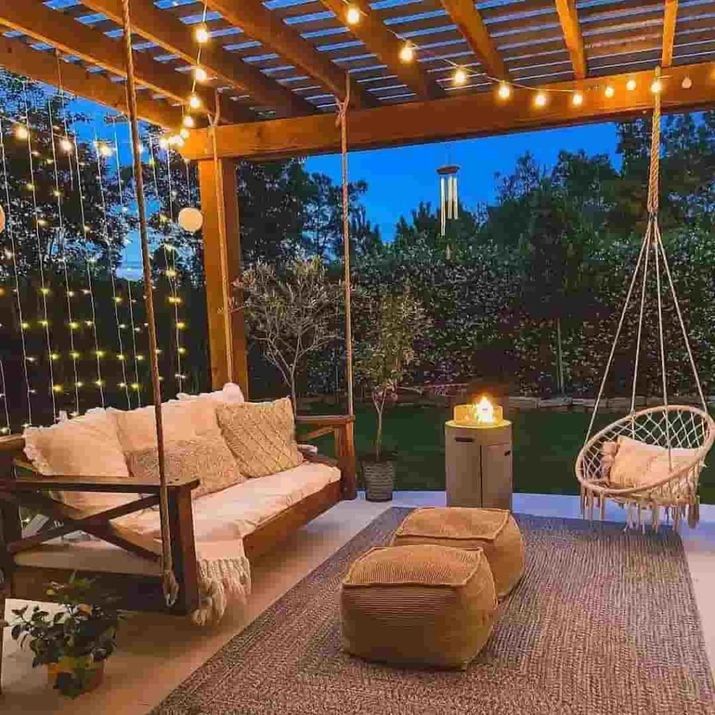 13. Cozy Boho Swing Patio with String Lights