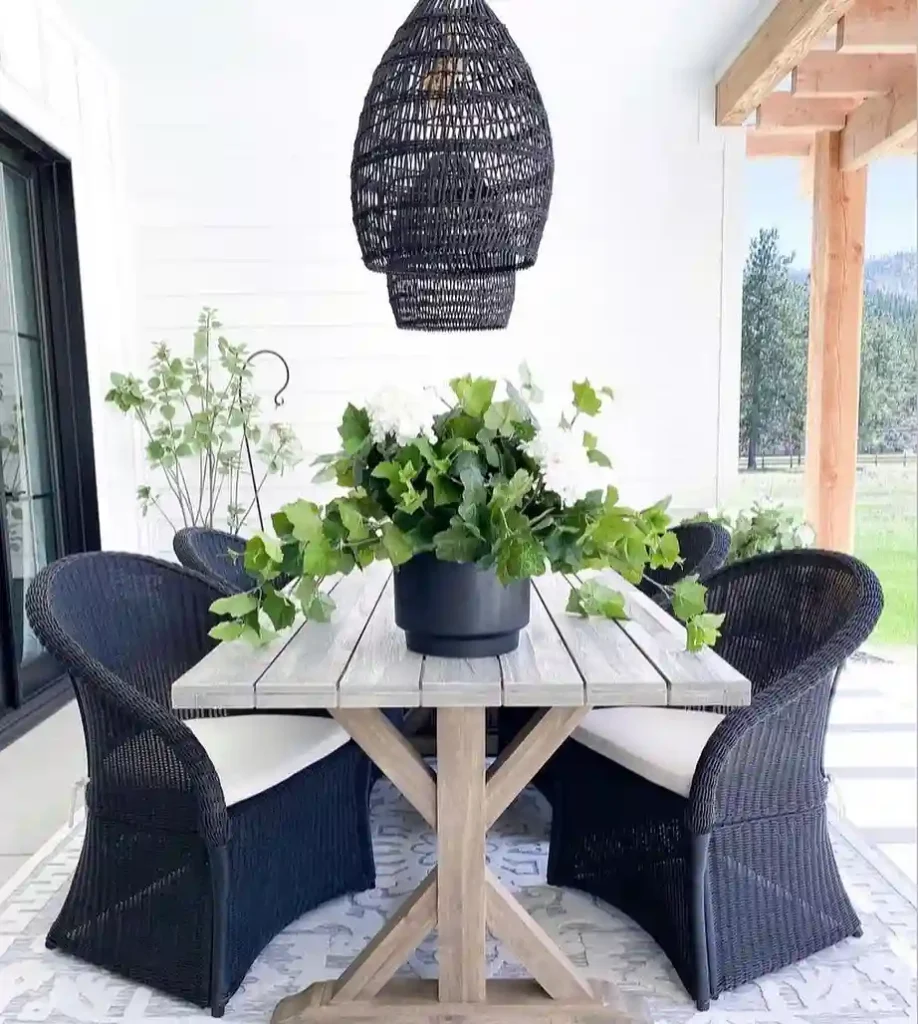 This patio blends sharp black wicker chairs with a natural wooden dining table, creating a striking balance of modern and farmhouse charm. The oversized black woven pendant light adds a sculptural element, while the leafy centerpiece keeps things fresh and organic. Soft cushions and a pale rug round out the look, making this setup feel polished yet inviting for dinners or weekend lounging.