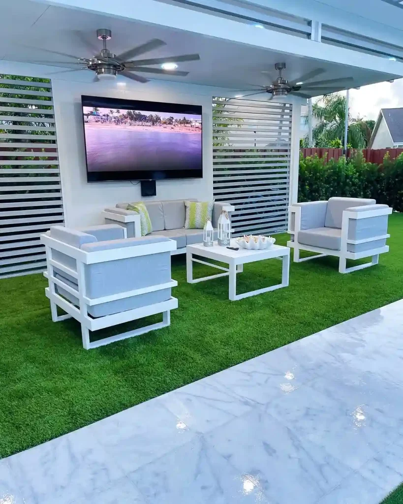 This backyard looks straight out of a resort. Sleek white-framed patio furniture sits atop vibrant artificial grass, creating a crisp contrast that’s easy on the eyes. A mounted flat-screen TV, dual ceiling fans, and matching white tables make it an ideal setup for movie nights or big game days under the open sky.