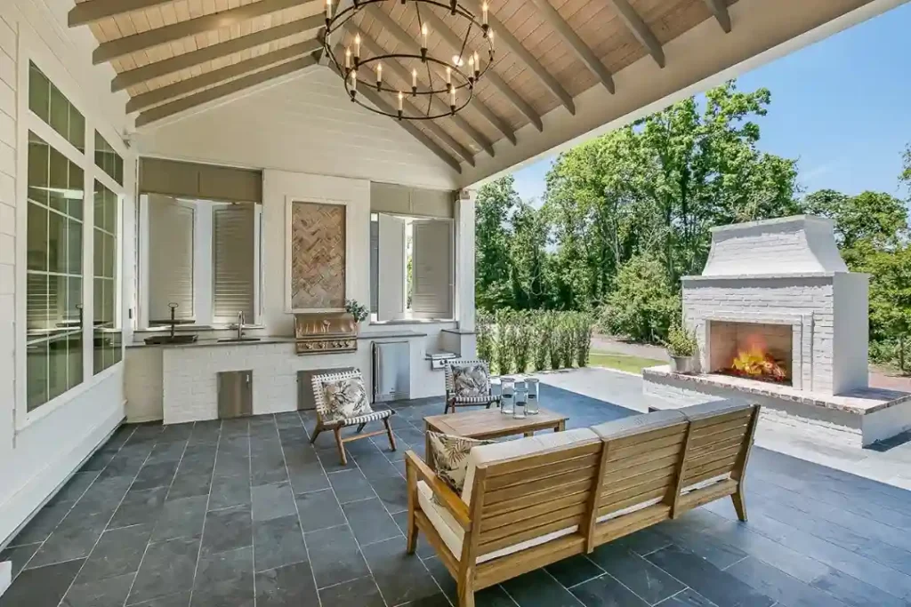 This luxurious setup combines grilling, dining, and fireside comfort. A vaulted ceiling with exposed beams frames a spacious built-in kitchen and lounge area, while the white brick fireplace brings warmth and sophistication. Pale wood furniture and patterned chairs add texture, making it both upscale and approachable.