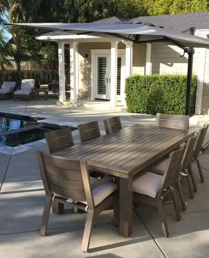 This patio embraces sleek functionality with a large wooden dining set that seats eight—ideal for summer barbecues and poolside brunches. The oversized offset umbrella provides much-needed shade, while the surrounding loungers hint at laid-back luxury. It’s a space designed for gathering, relaxing, and enjoying sunny afternoons in style.