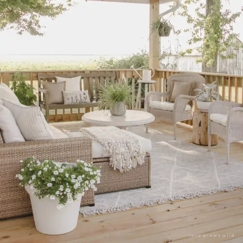 This covered patio is a picture of rustic tranquility. Woven rattan furniture, light wood tones, and creamy textiles come together for a look that’s both relaxed and refined. The white planter and cascading greenery add softness, while a chunky knit throw invites you to cozy up with a coffee. Perfect for lazy mornings or quiet evening chats.