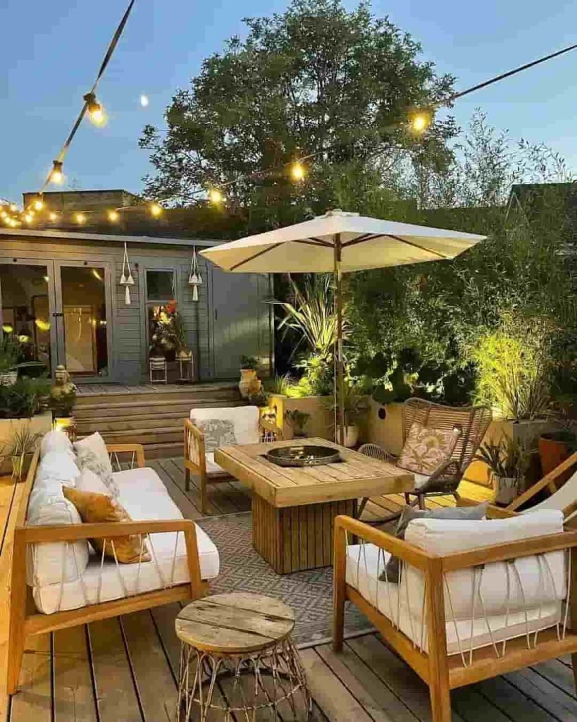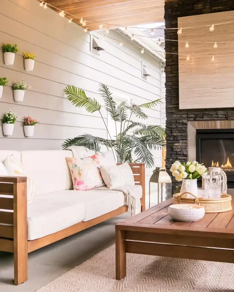 This covered patio proves you don’t need a massive space to make an impact. Warm-toned wood furniture, floral pillows, and a built-in fireplace give it a welcoming feel. The real magic, though, comes from the soft glow of string lights overhead and wall-mounted potted plants that add a fresh, vertical touch.