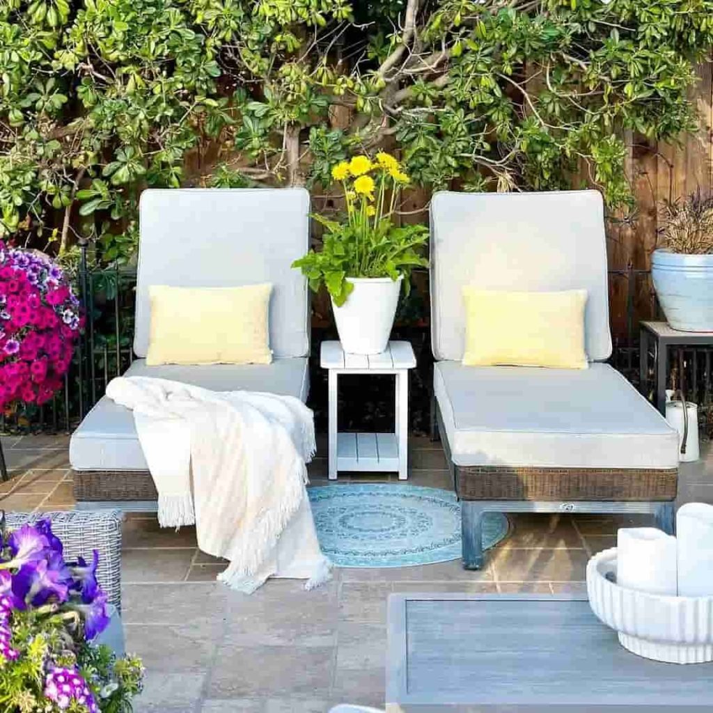 Set beneath lush green foliage, this patio pairs comfort with vibrancy. Two cushioned lounge chairs invite relaxation, each styled with buttery yellow pillows and a light throw. The potted yellow flowers echo the sunny tones, and the white side table keeps everything within reach—great for reading, sunbathing, or just doing nothing at all.
