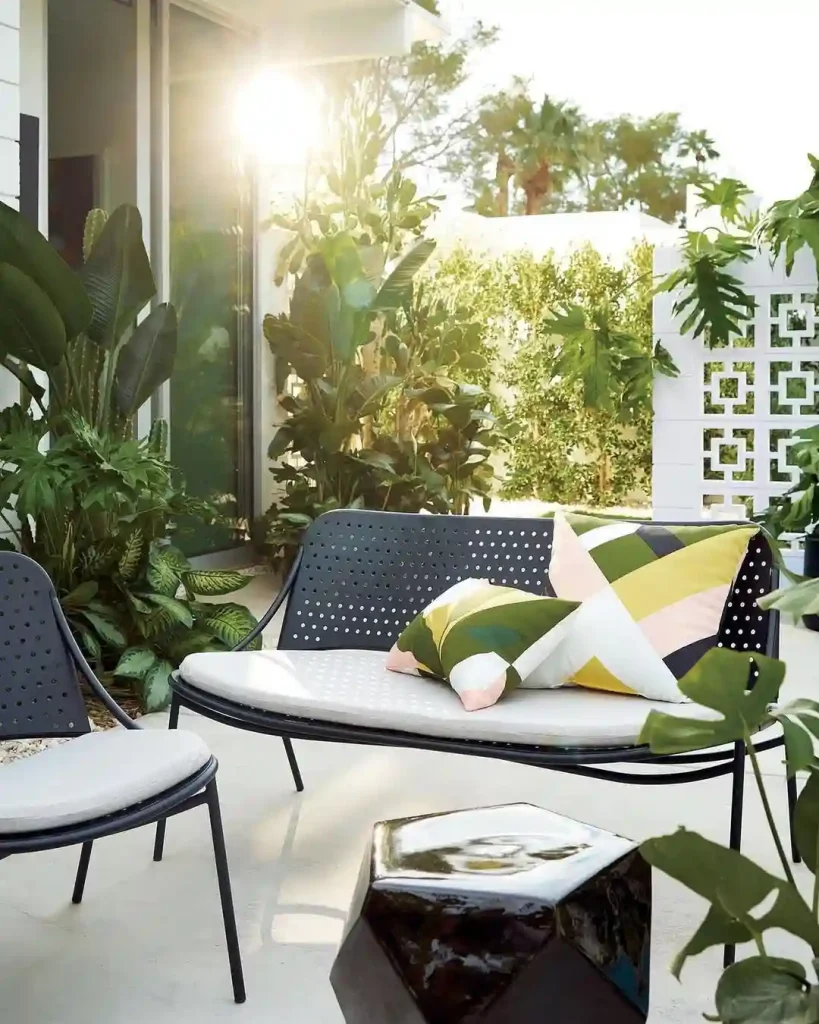 Clean lines and leafy greens make this setup a tropical haven. The black perforated metal bench and chair feel effortlessly cool, especially paired with colorful geometric pillows. Tall plants line the border, giving the whole space a lush, private feel. It’s the perfect blend of mid-century simplicity and backyard jungle energy.