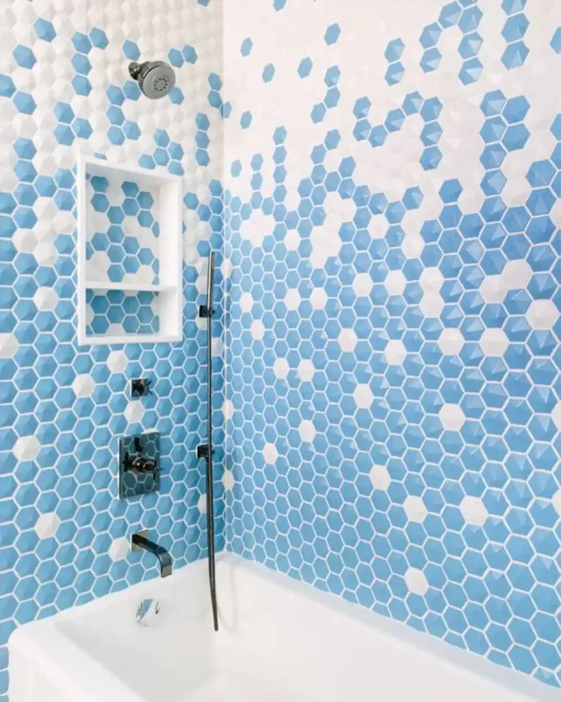 The mix of blue and white hexagon tiles creates a fresh and playful look. The pattern feels dynamic, especially when it flows across the walls and around the shower area. The soft blue tone keeps it light and refreshing rather than bold. Combined with white fixtures and clean lines, the space feels bright and full of personality. It’s a great choice if you want a pop of color without going too strong.