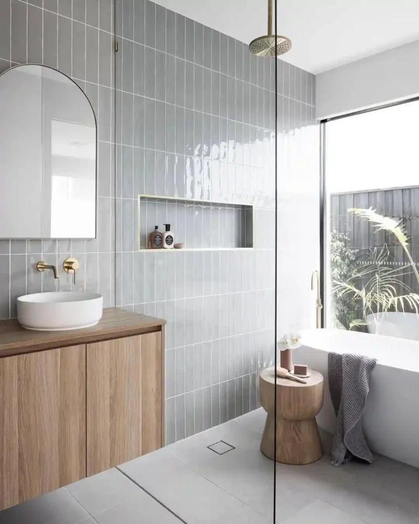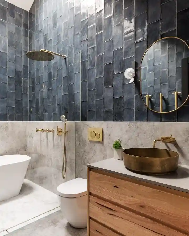 These deep blue vertical tiles add a rich, layered look that instantly makes the bathroom feel more styled. The slight variation in tone gives the wall a natural texture, especially when light hits it. Paired with brass fixtures and a warm wood vanity, the space feels balanced and inviting. The vertical layout also helps draw the eye upward, making the room feel taller. It’s a great choice if you want something bold but still refined.