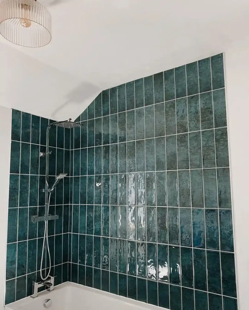 Glossy dark green tiles create a rich and slightly moody atmosphere. The reflective finish helps bounce light around, keeping the space from feeling too dark. Combined with gold accents and clean white elements, the overall look feels balanced and polished. It’s perfect for adding depth while still keeping the bathroom feeling fresh.