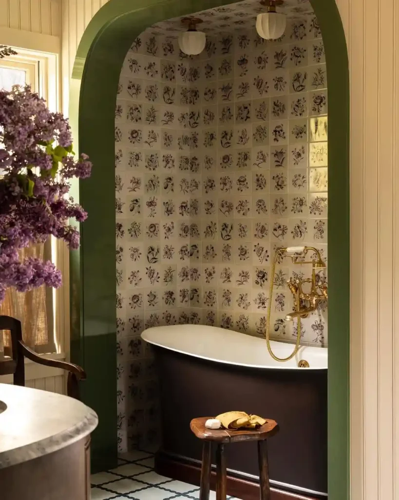 This bathroom feels warm and full of character with its small floral pattern tiles covering the walls. The repeated design creates a cozy, almost vintage feel, especially when paired with a freestanding tub and classic fixtures. The arch detail and soft lighting make the space feel more styled and personal. It’s perfect if you want your bathroom to feel unique instead of minimal, while still keeping a balanced and inviting look.
