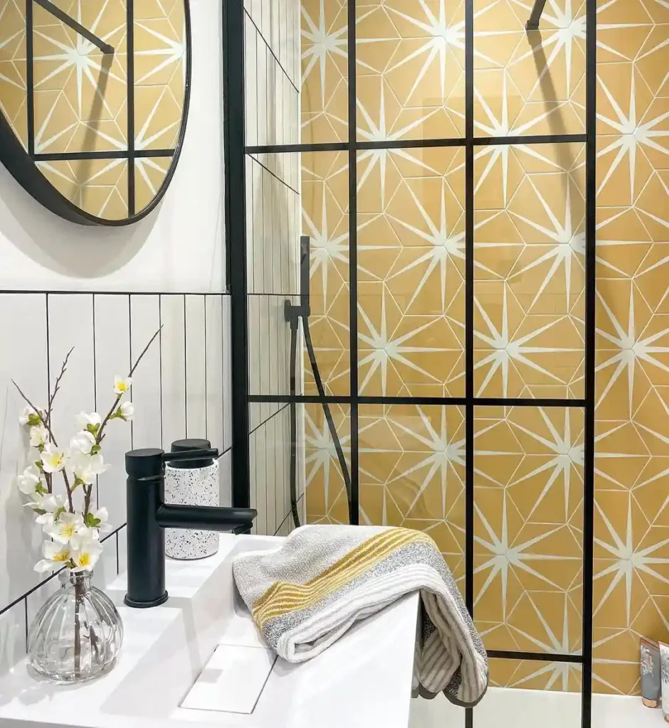 This design uses bold geometric tiles to create a strong focal point in the shower area. The repeating shapes add energy and movement, making the space feel more modern and creative. The black-framed glass helps structure the design while keeping everything visible and open. When the rest of the bathroom stays simple, this kind of tile really stands out. It’s a great choice if you want something eye-catching.