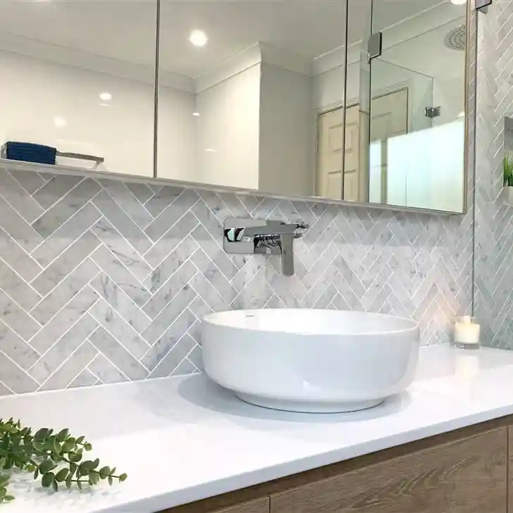 A herringbone layout instantly adds a sense of detail to classic marble tiles. The angled pattern breaks up the usual straight lines and makes the wall feel more styled. Paired with a simple sink and light wood vanity, it keeps the look balanced and fresh. The soft gray tones in the marble add texture without overwhelming the space. This is a great way to make a small area feel more interesting.