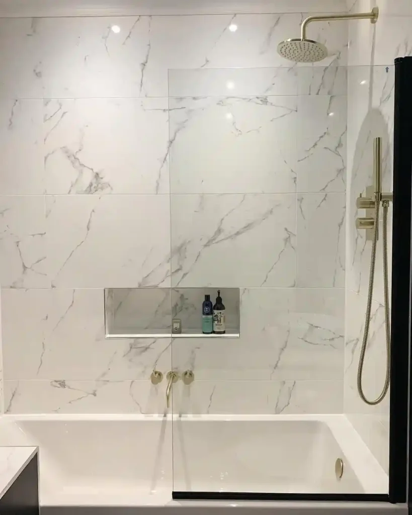 These large marble-effect tiles instantly make the bathroom feel clean and open. The soft gray veining adds just enough detail without making the walls look busy. Because the tiles are bigger, there are fewer grout lines, which helps the space feel seamless and easy to maintain. Paired with gold or brass fixtures, the whole setup feels calm and slightly luxurious without trying too hard. It’s a great choice if you want something timeless that still feels modern.