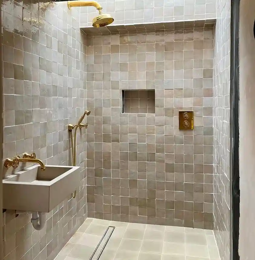 Small square tiles add texture and a handcrafted feel to the shower area. The slightly varied tones give the walls a natural look that feels warm and inviting. Built-in niches and simple fixtures keep the design practical while still looking styled. This works well if you want something simple but not completely plain.