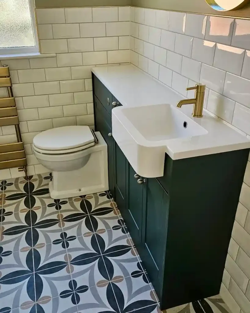 This retro-inspired tile design adds a playful and slightly nostalgic feel. The repeating shapes create movement across the floor while still keeping a balanced color palette. Paired with simple fixtures and compact furniture, it keeps the space feeling fresh rather than outdated. It’s a great way to bring personality into a small bathroom.