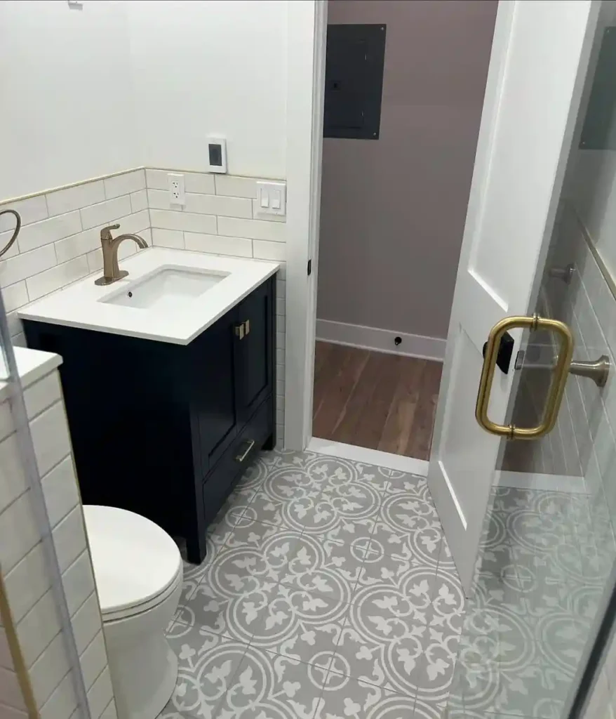 Using patterned tiles on the floor is a smart way to add interest without overwhelming a small bathroom. The soft gray and white design creates movement while still feeling light and clean. With simple white walls and a compact vanity, the floor becomes the main feature. It helps define the space and makes it feel more designed, even if everything else is kept simple. This works especially well in narrow or compact layouts.