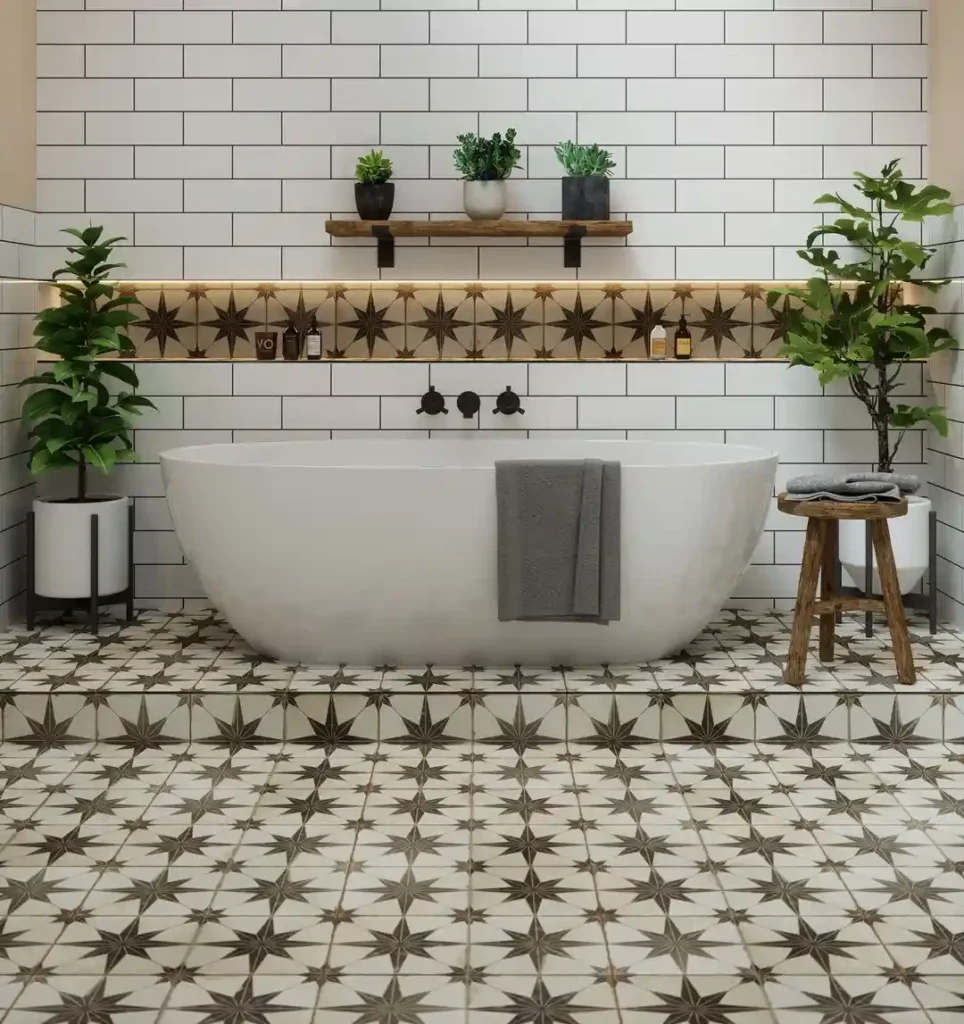 Star-pattern tiles bring a bold and eye-catching design to both floors and walls. The repeated shape creates a strong visual rhythm that makes the bathroom feel more styled. Keeping the rest of the space simple allows the pattern to stand out. It’s a great choice if you want a statement look that still feels balanced.