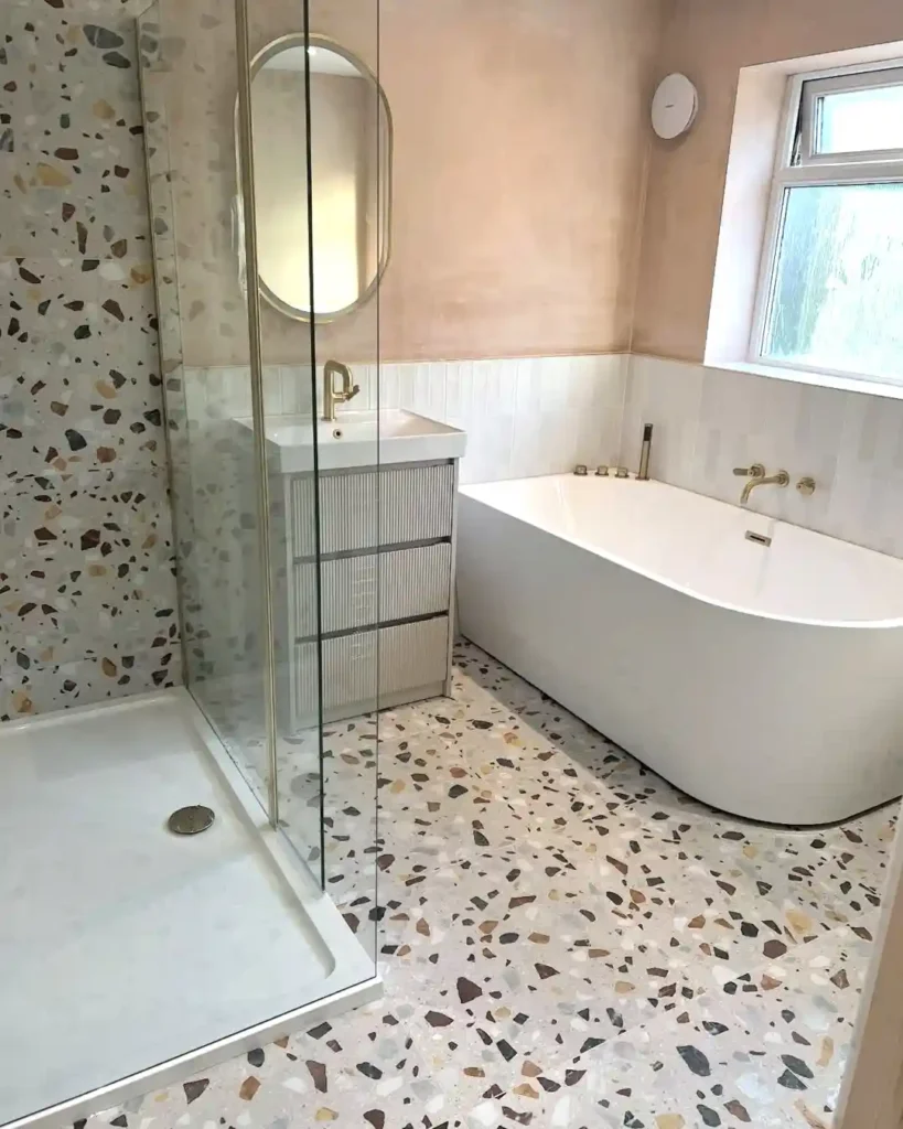 Terrazzo tiles bring texture and a playful mix of tones into the bathroom. The scattered stone pieces create a natural pattern that feels relaxed but still stylish. Used on both the floor and shower area, it ties the whole space together without needing extra decoration. Paired with soft neutral walls and simple fixtures, the terrazzo becomes the highlight. It’s a great option if you want something modern that doesn’t feel too plain.