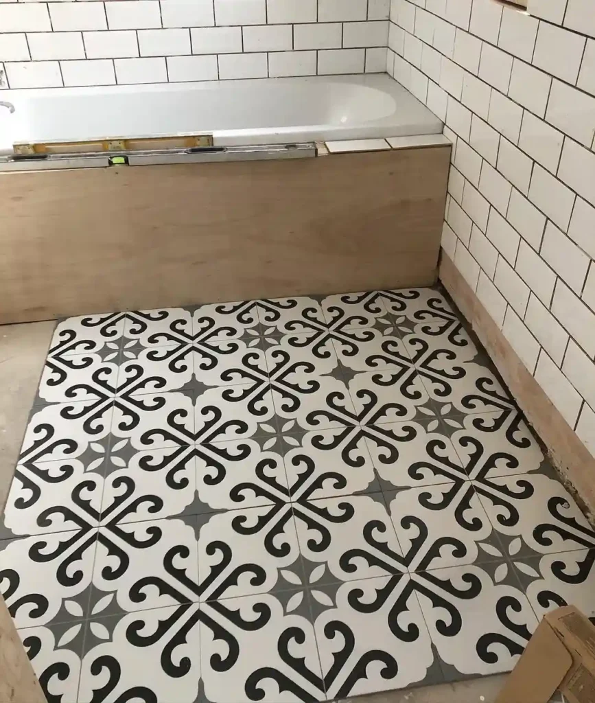 These vintage-style tiles bring charm and personality to the bathroom floor. The black and white pattern creates a strong visual base that anchors the space. When paired with simple wall tiles, the floor becomes the main highlight without overwhelming the room. It’s a great option if you want a classic look that still feels full of character.