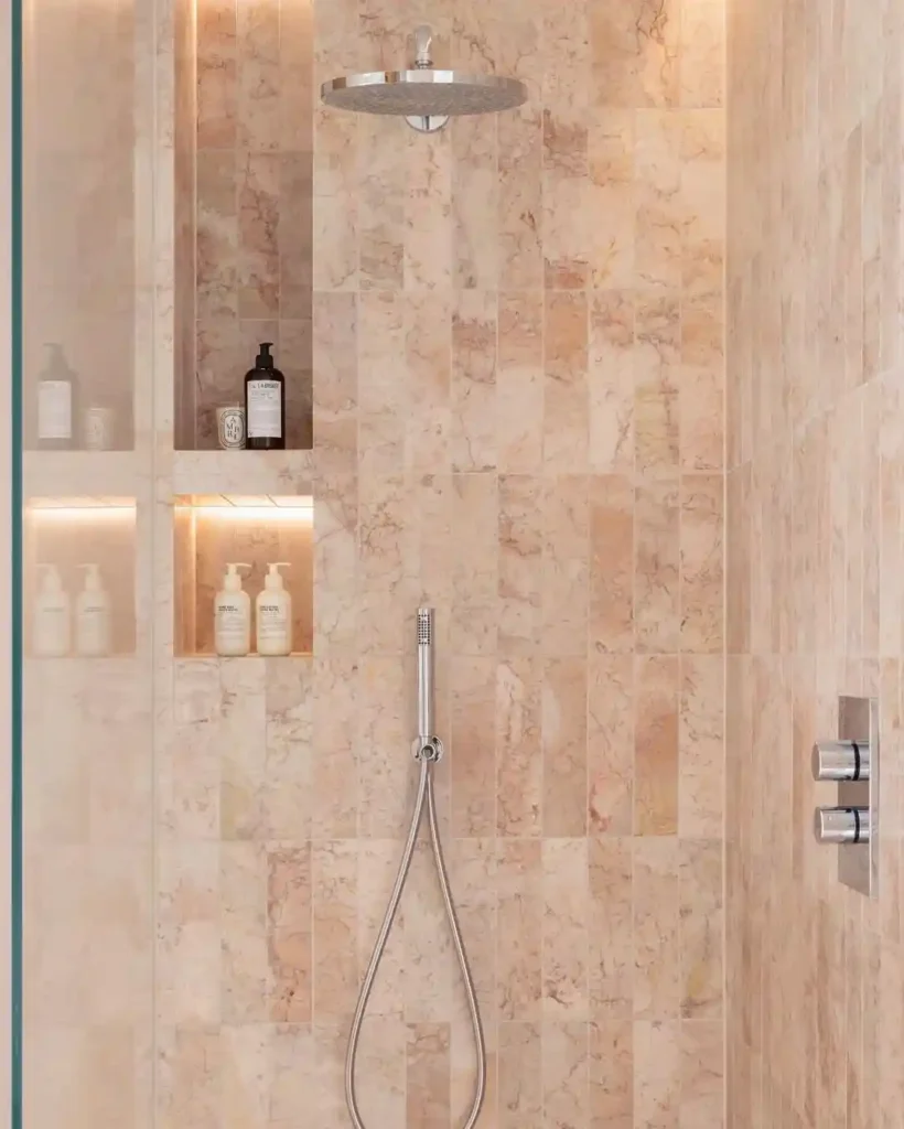 This shower uses warm beige stone tiles to create a soft, calming feel. The natural variation in color gives the walls a subtle texture that feels more relaxed than bright white tiles. Built-in niches with lighting add both function and a cozy glow. The overall look feels spa-like without being too minimal. It’s perfect if you prefer warmer tones and want your bathroom to feel more inviting.