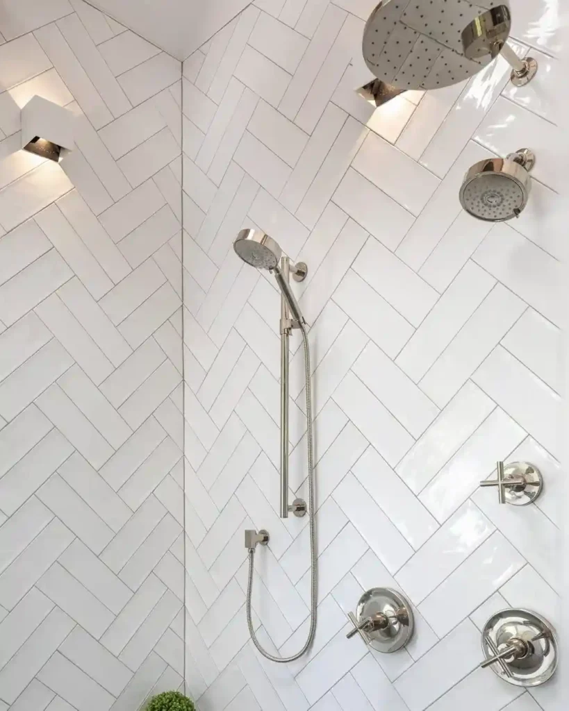 A herringbone layout gives classic white tiles a completely different feel. The angled pattern adds detail and texture while still keeping everything light and clean. Paired with chrome fixtures, the space feels crisp and well-finished. This design works especially well in showers where you want something subtle but still visually interesting. It’s simple, but it never looks boring.