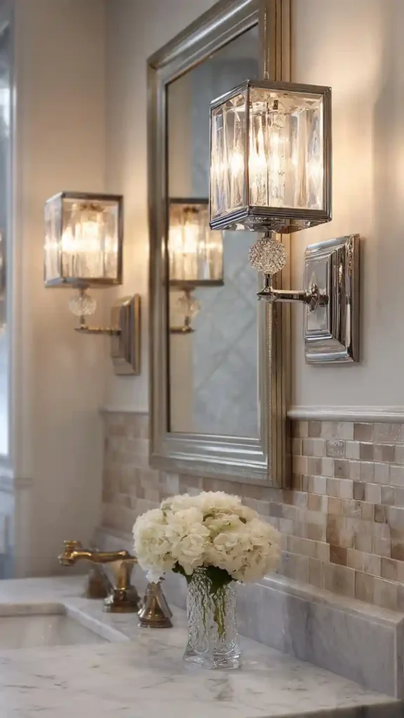 Crystal-accent wall sconces can add a small layer of elegance without making the bathroom feel overly decorative. When mounted beside a large vanity mirror, the crystals catch the light and create gentle reflections across the wall and countertop.