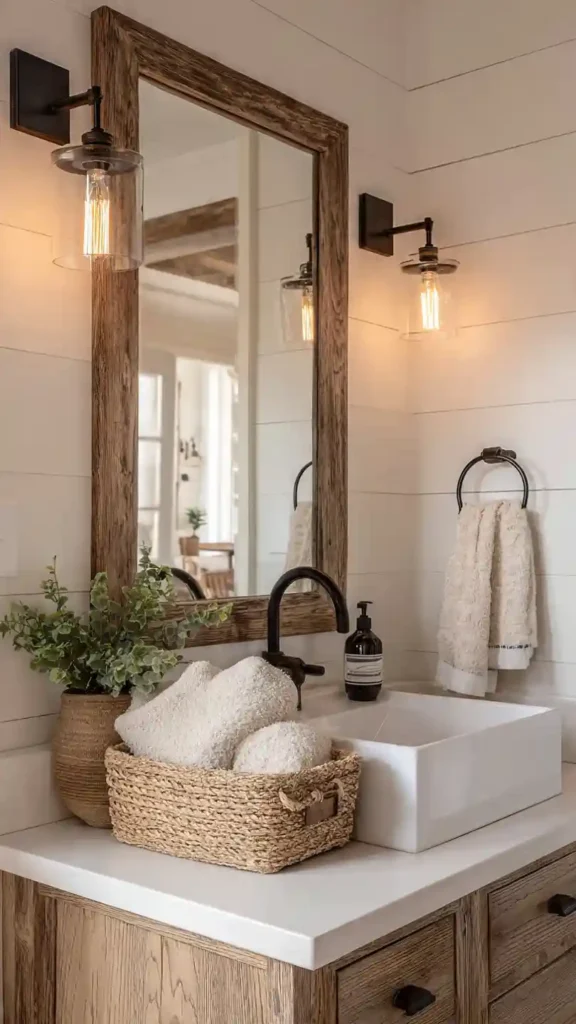 Farmhouse bathrooms often rely on warm lighting to create a welcoming feel. Vintage-style sconces with clear glass shades and exposed Edison bulbs bring a cozy glow to the vanity wall. When mounted on both sides of a rustic wood-framed mirror, the lighting feels balanced and comfortable.