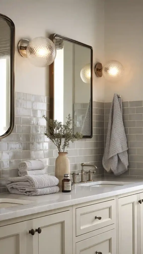 This style works especially well in bathrooms with white subway tiles, a floating vanity, and neutral color palettes. Because the globes are simple and smooth, they blend easily with both modern and classic interiors while still making the lighting feel intentional and balanced.