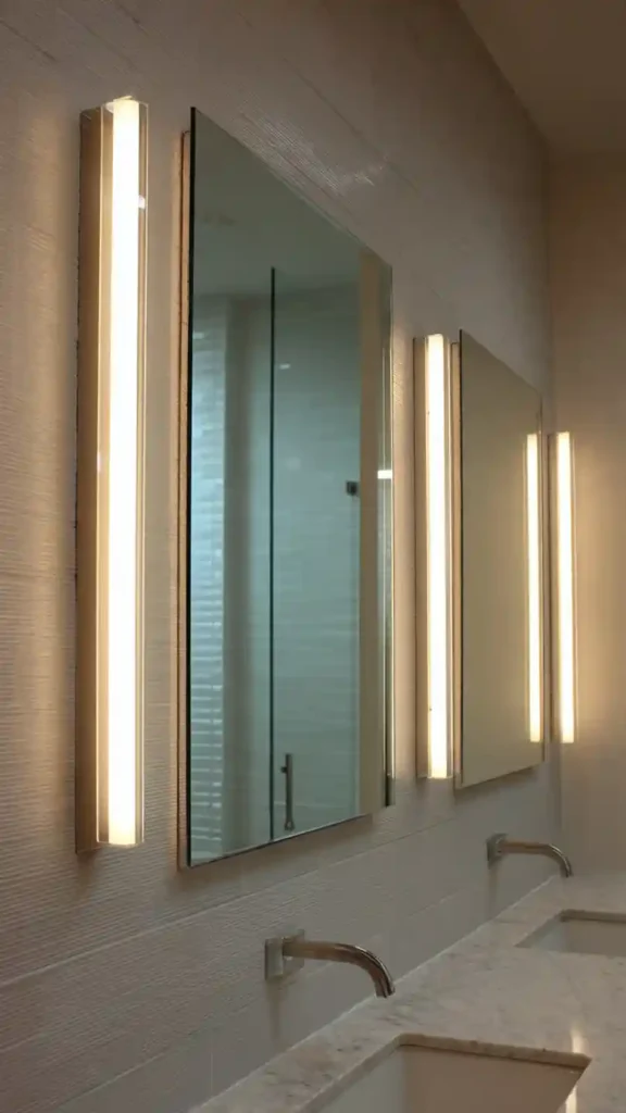They look especially striking beside a large frameless mirror above a double vanity. In modern bathrooms with light stone counters and minimal decor, the slim vertical lights add a polished touch without making the vanity wall feel crowded. The result is a bathroom that feels bright, open, and thoughtfully designed.