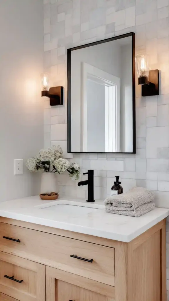 Slim matte black wall sconces can instantly give a bathroom a clean, modern edge. When installed beside a mirror above a white vanity, the dark finish creates a subtle contrast that helps the lighting stand out without overpowering the room.